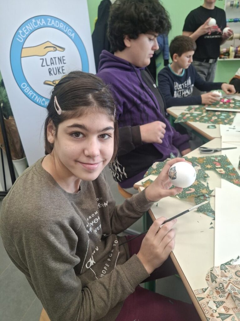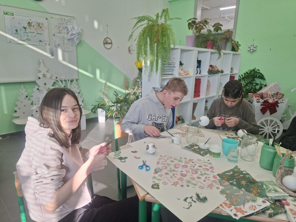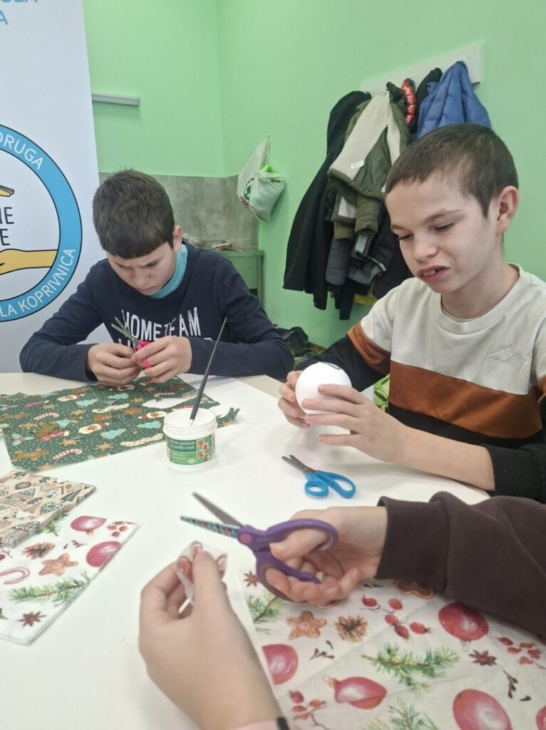 Radionici su se pridružili učenici osmog razreda COOR-a Podravsko Sunce, koji su u lijepoj i ugodnoj atmosferi, uz božićnu glazbu, smijeh i druženje, izrađivali božićne kuglice dekupaž tehnikom. Učenici su s puno spretnosti i kreativnosti izradili svoje radove te uživali u toplom blagdanskom ozračju škole.