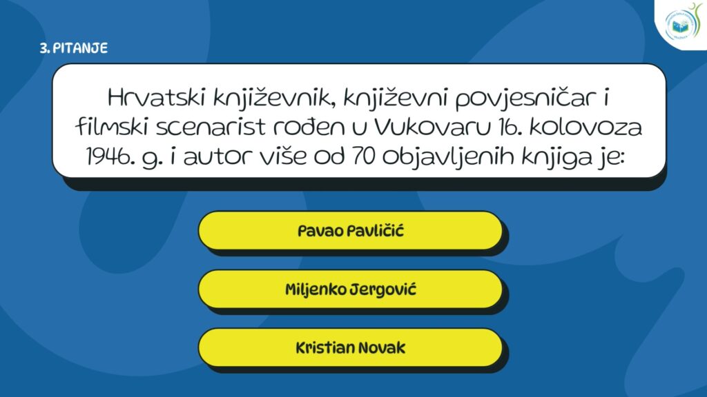 U sklopu kulturno-javne djelatnosti kroz listopad i studeni obilježavamo Mjesec hrvatske knjige kratkim kvizom koji se može vidjeti u hodniku naše škole i u školskoj knjižnici.