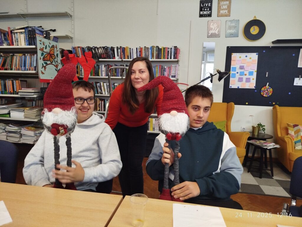 U prosincu nas uvijek čeka najveselije doba godine pa smo se jako veselili druženju uz uređenje knjižnice s učenicima pomoćnih zanimanja koje polako postaje tradicionalno. U ponedjeljak 24. studenoga kroz nekoliko sati nastave okupili smo učenike 1. g, 2. g i 3. g razreda te njihove nastavnike koji su pomogli u izradi i postavljanju ukrasa za knjižnicu. Kartonske kutije omotali smo novinskim papirom i ukrasili božićnim mašnama, izradili smo natpis za pano u knjižnici i dali imena božićnim patuljcima – Patrik, Leon i Dean.